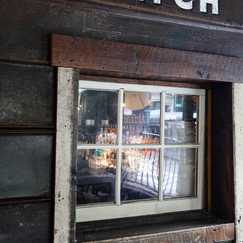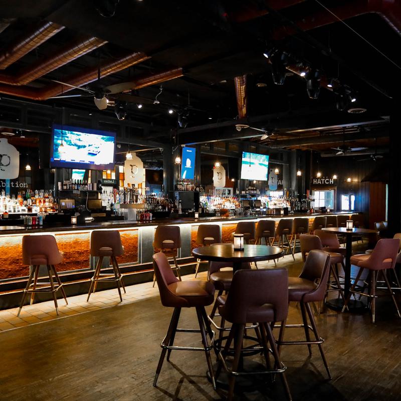 Into a swanky watering hole with reclaimed-wood furnishings and a covered patio.